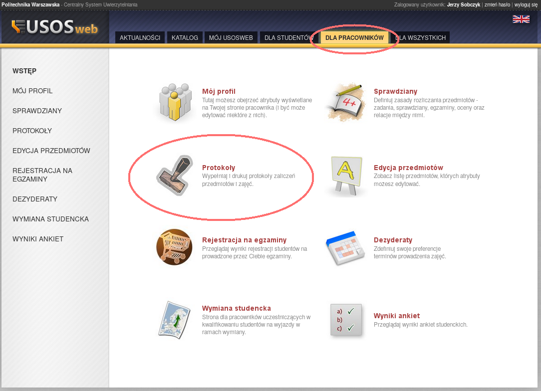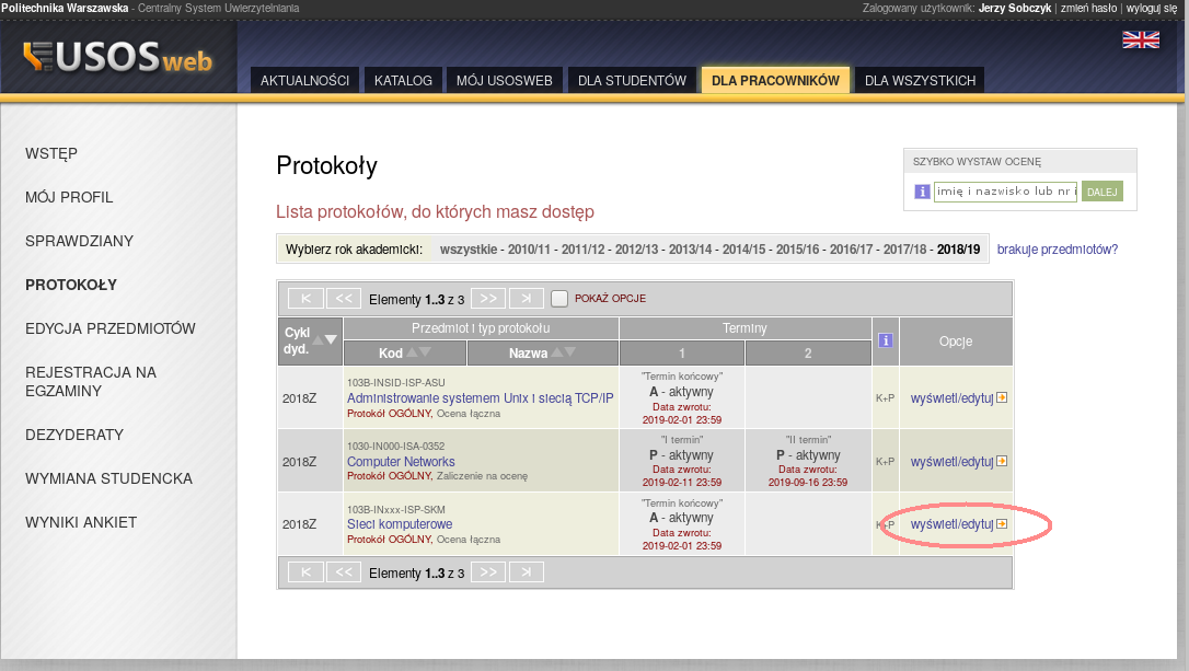 Po zalogowaniu w USOSie wybieramy zakłądkę "Pracownicy" a następnie "Protokoły". Wybieramy właściwy przedmiot i rodzaj protokołu (najczęściej będzie to protokół pełny).
