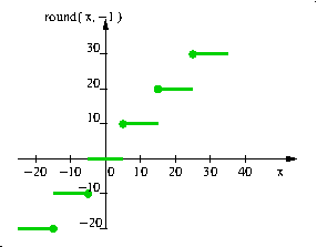 Dostępna jest dwuargumentowa funkcja zaokraglenia round realizująca zakraglenie zgodnie z regułą: "round half away from zero" lub "round half towards infinity". Oznacza to, ze przedziały stałej wartości funkcji są domkniete od strony zera tak jak to przedstawiają poniższe rysunki.