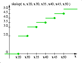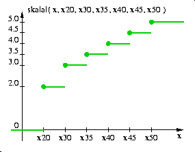 Dostępne są cztery funkcje obliczające ocenę w przyjętej na wydziale skali ocen: 0, 2, 3, 3.5, 4, 4.5, 5 - są to skalal, skalap, skalalk, skalapk. We wszystkich czterech przypadkach lista argumentów powinna zawierać siedem wartości: liczbę punktów uzyskanych przez studenta i progi odpowiadające ocenom: 2, 3, 3.5, 4, 4.5, 5. Funkcje skalal i skalalk obliczają funkcję schodkową lewostronnie domkniętą, natomiast funkcje: skalap i skalapk prawostronnie domkniętą tak jak to przedstawiają poniższe rysunki.