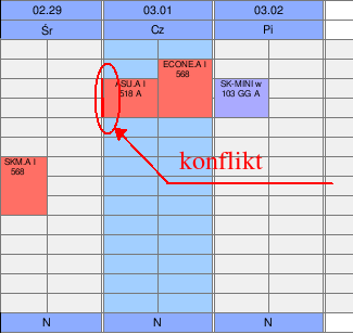 W planie mogą wystąpić konflikty, czyli zderzenia kilku zajęć w tym samym czasie. W takiej sytuacji kolumny odpowiadające dniom są dzielone na odpowiednią ilość podkolumn. Ze względów estetycznych liczba podkolumn jest jednakowa dla wszystkich dni. Fakt wystąpienia konfliktu jest dodatkowo sygnalizowany czerwonym kolorem w wąskiej kolumnie rozdzielającej dni tygodnia po lewej stronie zajęć będących w konflikcie.