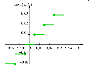 Dostępna jest dwuargumentowa funkcja zaokraglenia round realizująca zakraglenie zgodnie z regułą: "round half away from zero" lub "round half towards infinity". Oznacza to, ze przedziały stałej wartości funkcji są domkniete od strony zera tak jak to przedstawiają poniższe rysunki.