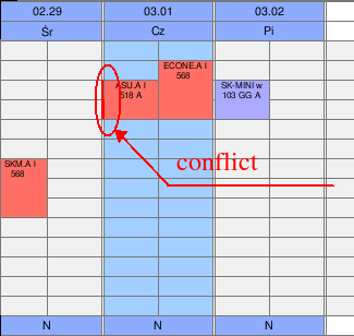 The schedule can contain conflicts eg. two or more classes scheduled at the same time. In such a case the program will split day columns into necessary number of subcolumns. For esthetical reasons number of subcolumns will be kept the same for all days. The conflict is additionally signaled by red color in the colmn separating days located on the left to the conflicting classes.